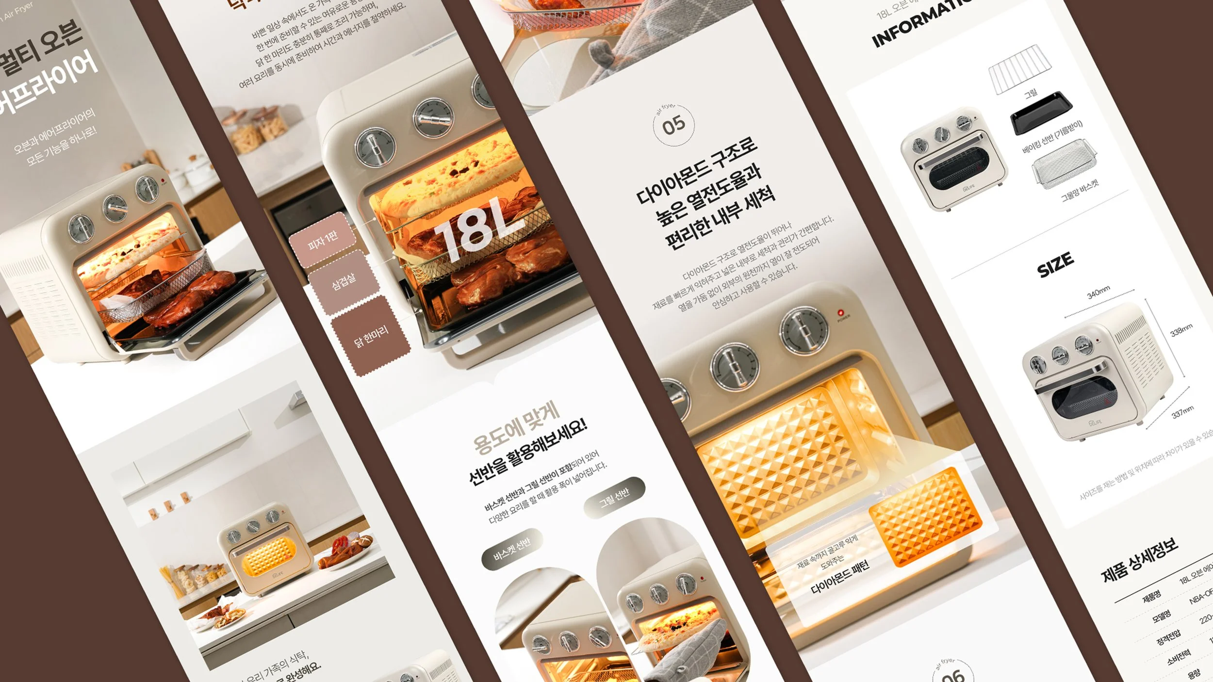 이노뷰 18L 멀티 오븐 에어프라이어는 압도적인 18L 대용량과 다각도 조리가 가능한 멀티 기능을 결합하여 주방의 새로운 기준을 제시하는 스마트 가전입니다. 본 프로젝트에서는 단순한 조리 기구를 넘어 홈 쿡(Home Cook) 라이프스타일을 완성하는 핵심 오브제로서의 가치를 전달하기 위해, 감각적인 라이프스타일 컷과 제품의 세부 디테일을 강조한 클로즈업 샷을 전략적으로 배치하였습니다. 특히 오븐, 에어프라이어, 로티세리 등 복잡한 다기능성을 소비자가 직관적으로 이해할 수 있도록 체계적인 레이아웃과 명확한 인포그래픽을 활용하여 디자인하였으며, 이노뷰만의 미니멀한 화이트/메탈 톤을 상세페이지 전체의 무드로 확장하여 프리미엄 가전 브랜드의 신뢰도를 시각화했습니다.