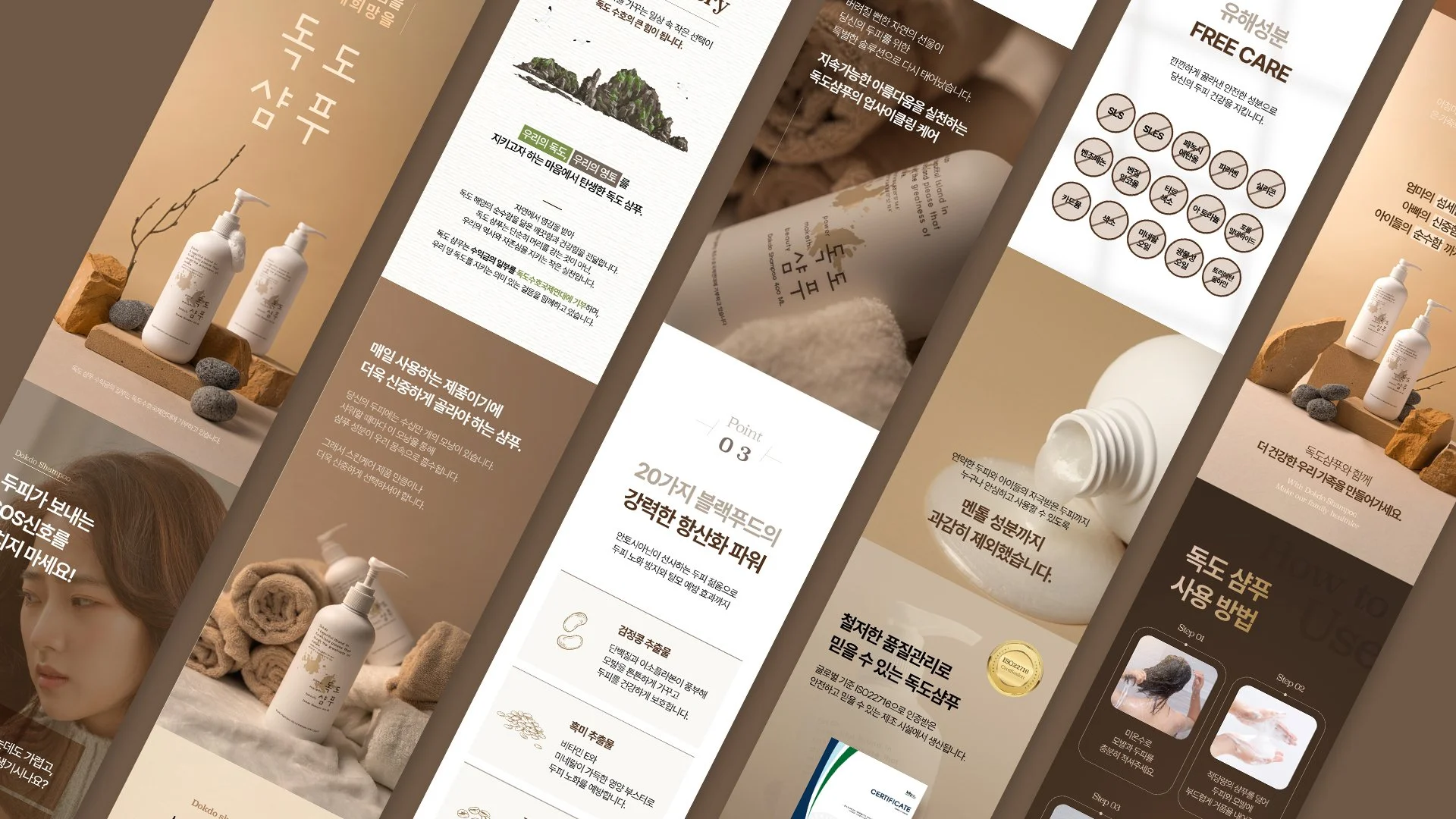 독도 샴푸가 가진 순하고 정제된 이미지를 시각적으로 전달하기 위해 자연 소재와 부드러운 컬러 톤을 중심으로 촬영을 진행했습니다. 스톤, 우드, 패브릭 등의 오브제를 활용해 자연에서 온 성분과 편안한 사용감을 표현하고자 했으며, 손에 쥐거나 거품이 닿는 장면을 통해 일상 속에서 사용하는 데일리 케어 제품의 이미지를 담아냈습니다.