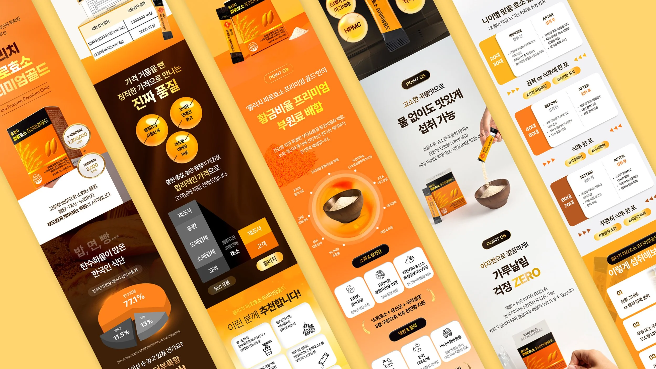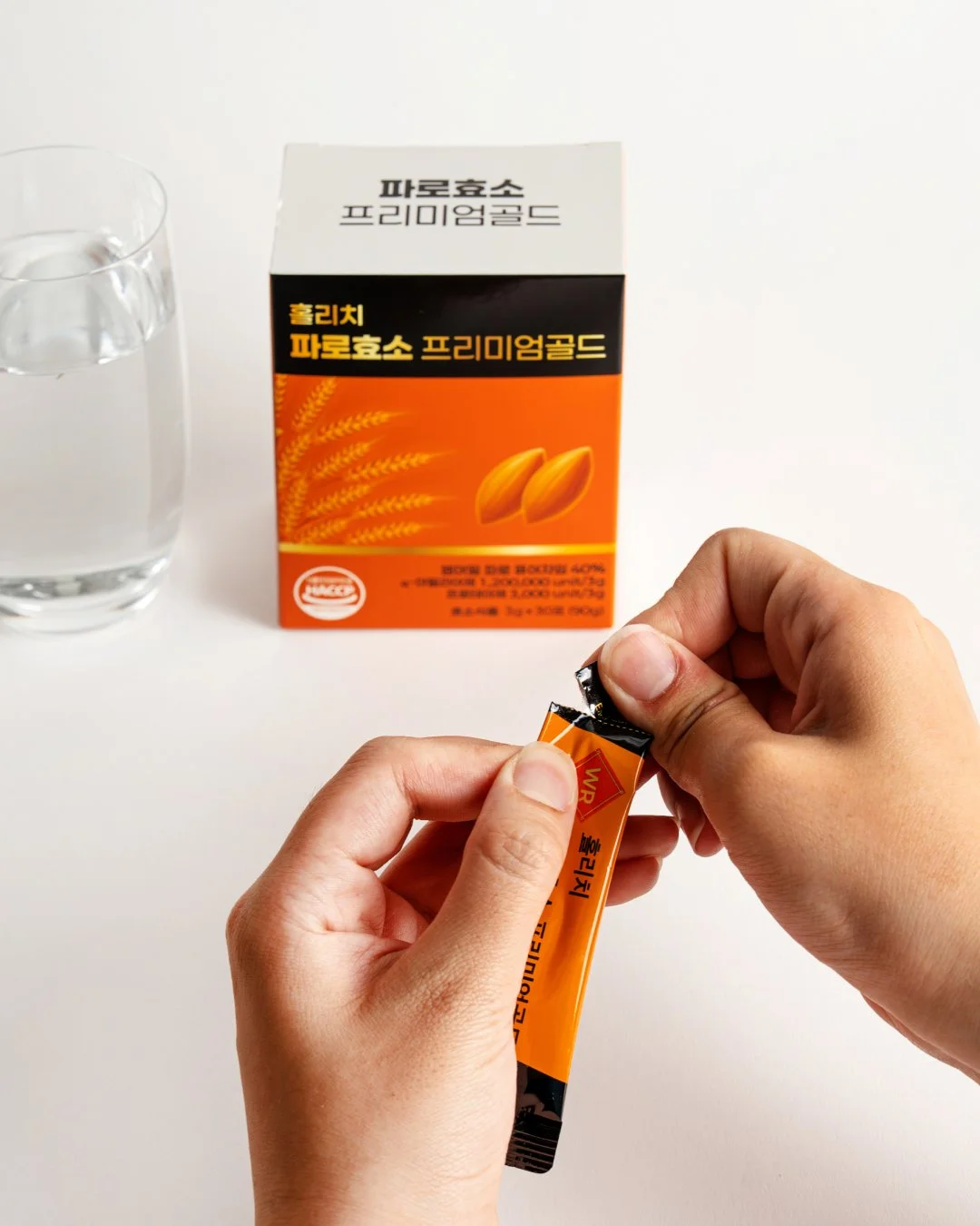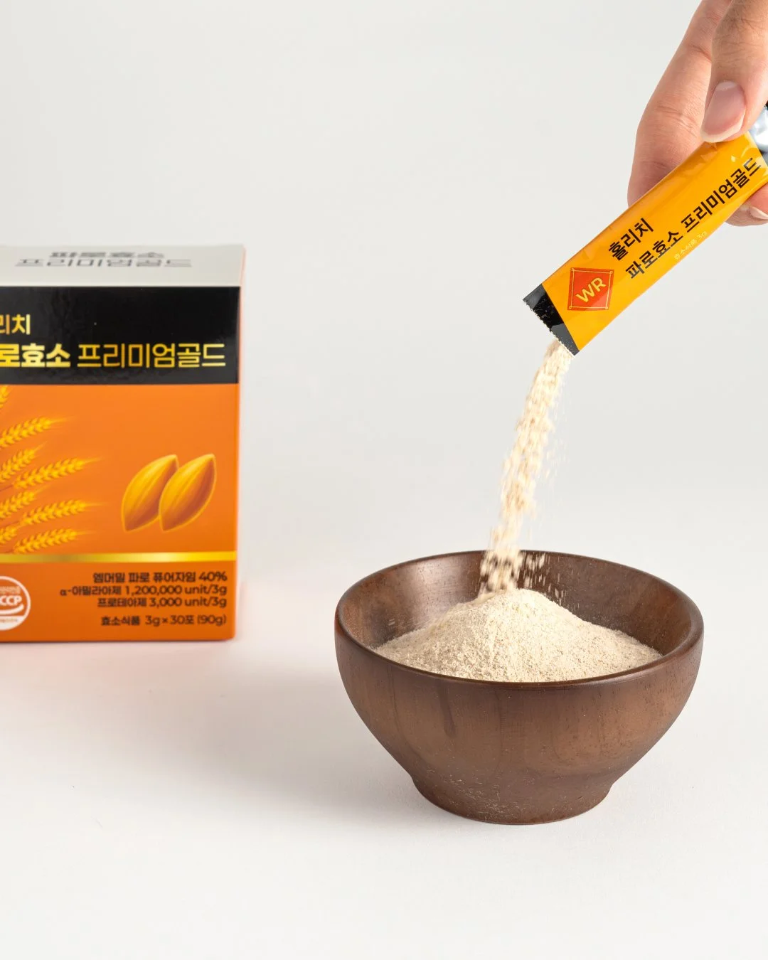 파로효소 프리미엄 골드의 기능성과 신뢰감을 직관적으로 전달하기 위해 선명한 오렌지 톤을 메인 컬러로 촬영을 기획했습니다. 제품 패키지의 컬러 아이덴티티가 가장 돋보이도록 배경과 소품을 최소화해 브랜드 메시지에 집중할 수 있는 구도로 구성했습니다. 스틱형 개별 포장과 분말 형태의 질감을 강조하기 위해 개봉 컷, 파우더 연출 컷, 섭취 장면을 함께 담아 제품의 사용 방식이 자연스럽게 이해되도록 연출했습니다. 이를 통해 일상 속에서 간편하게 섭취할 수 있는 프리미엄 효소 제품의 이미지를 시각적으로 완성했습니다.