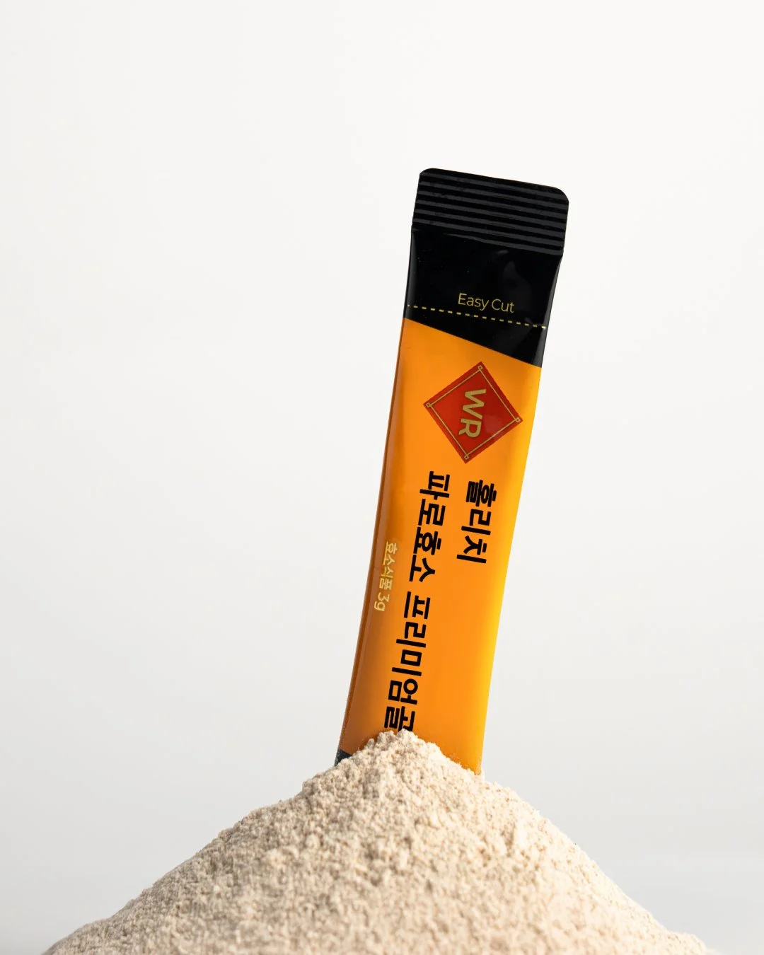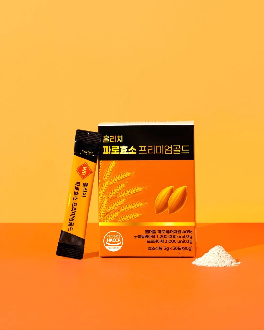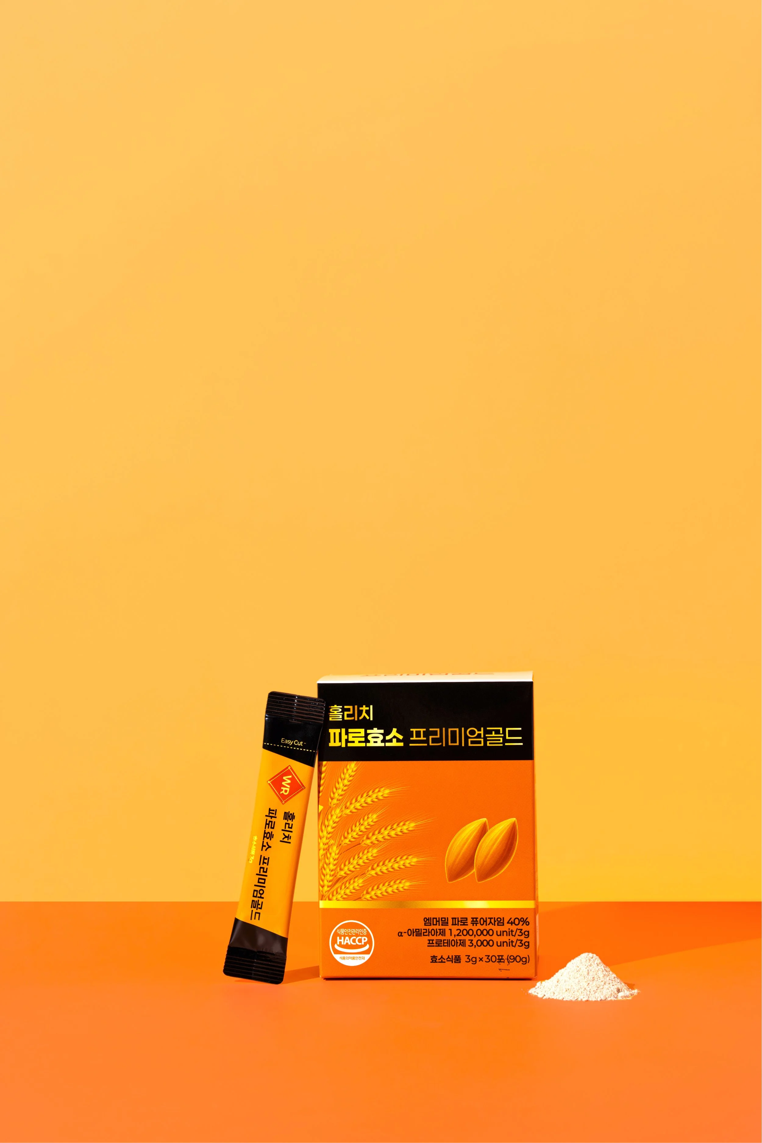 파로효소 프리미엄 골드의 기능성과 신뢰감을 직관적으로 전달하기 위해 선명한 오렌지 톤을 메인 컬러로 촬영을 기획했습니다. 제품 패키지의 컬러 아이덴티티가 가장 돋보이도록 배경과 소품을 최소화해 브랜드 메시지에 집중할 수 있는 구도로 구성했습니다. 스틱형 개별 포장과 분말 형태의 질감을 강조하기 위해 개봉 컷, 파우더 연출 컷, 섭취 장면을 함께 담아 제품의 사용 방식이 자연스럽게 이해되도록 연출했습니다. 이를 통해 일상 속에서 간편하게 섭취할 수 있는 프리미엄 효소 제품의 이미지를 시각적으로 완성했습니다.