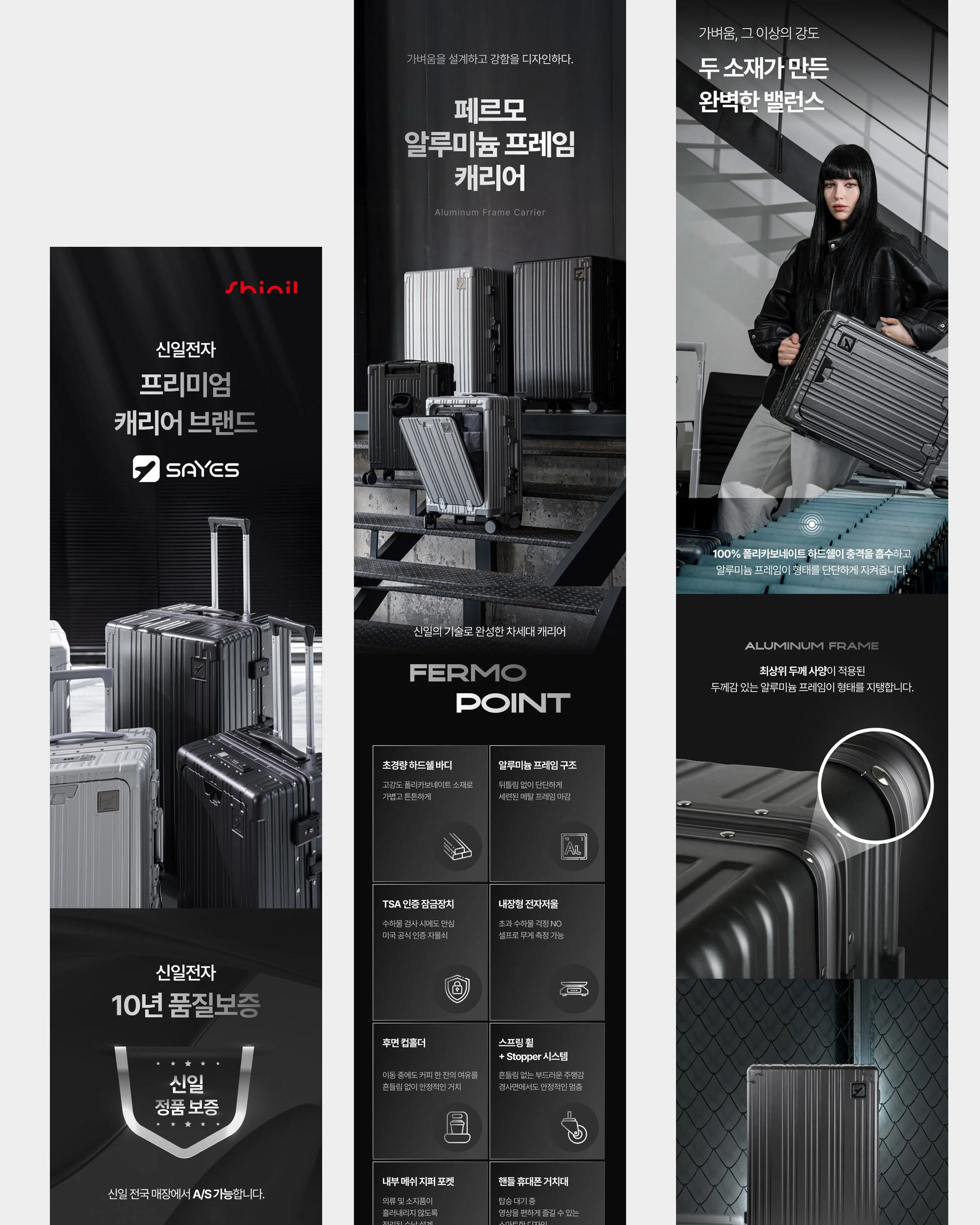 신일 페르모 알루미늄 프레임 캐리어는 알루미늄 프레임 구조를 가진 여행용 캐리어로, PC 외피와 폴리에스터 안감을 바탕으로 내구성과 충격 보호력을 높인 실용적인 디자인이 특징입니다. 프레임 방식 덕분에 수하물 보호와 견고함이 뛰어나고, 기내용과 화물용 등 다양한 사이즈 선택이 가능해 짧은 여행부터 장기 여행까지 두루 쓸 수 있으며, 앞판 오픈형이나 전자저울 같은 편의 기능을 갖춘 모델도 있어 여행 준비를 더 수월하게 해줍니다.